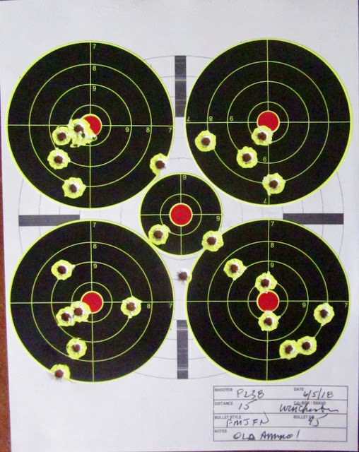 I still had a box of 13-year-old Winchester 95-grain FMJ FN (flat nose), but also bought a box of Federal FMJ from Wally World (great place to shop for ammo late at night!). My first 12 rounds looked like this: